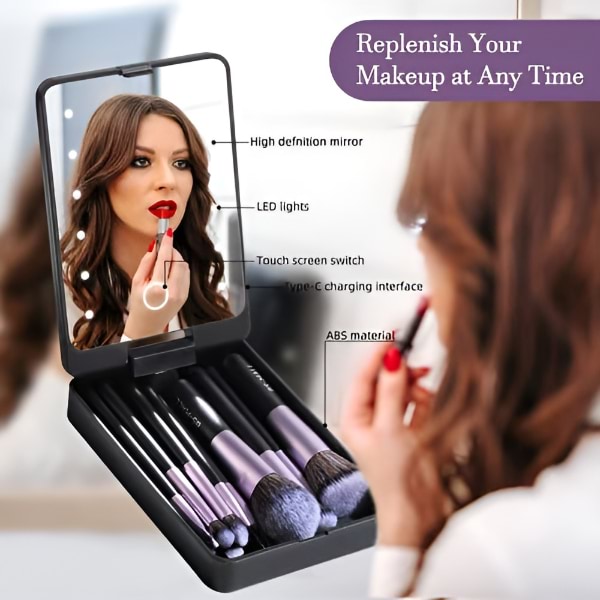 Με αυτό το σετ ταξιδιωτικών πινέλων μακιγιάζ και καθρέφτη LED, απολαύστε την ευκολία της άψογης εφαρμογής μακιγιάζ όπου κι αν βρίσκεστε, καθιστώντας το ιδανικό εργαλείο στα ταξίδια σας.