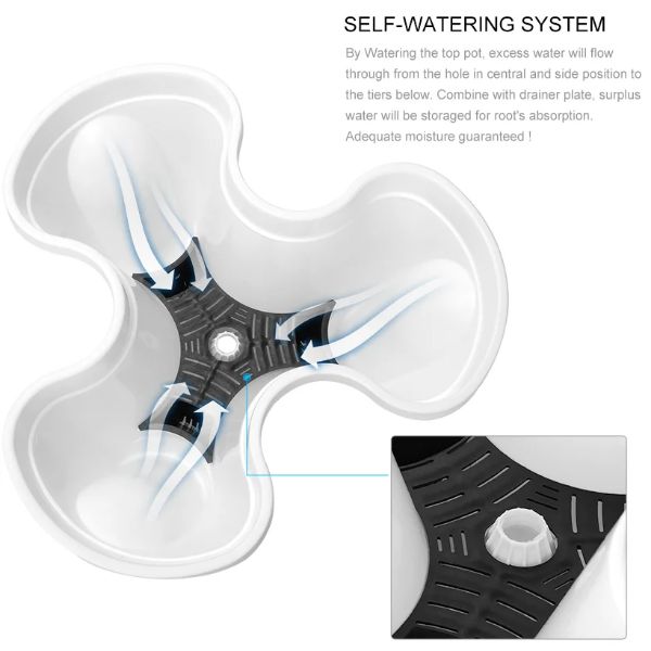 - ΣΥΣΤΗΜΑ ΑΥΤΟΠΟΤΙΣΜΑΤΟΣ: Κάθε μία από τις εσοχές της ζαρντινιέρας διαθέτει μια ενσωματωμένη δεξαμενή ποτίσματος με κατεύθυνση προς τα κάτω. Ο σχεδιασμός αποστράγγισης επιτρέπει στο νερό να κυλήσει στην επόμενη βαθμίδα μέχρι τελικά να καταλήξει στον τελευταίο δίσκο συλλογής νερού. Αυτό θα διατηρήσει τα φυτά υγιή και οι ρίζες δεν θα κινδυνεύσουν να σαπίσουν.